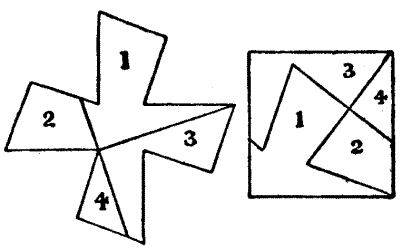 Next we have the Geometrical Puzzle, a favourite and very ancient branch of which is the puzzle in dissection, requiring some plane figure to be cut into a certain number of pieces that will fit together and form another figure. Most of the wire puzzles sold in the streets and toy-shops are concerned with the geometry of position.