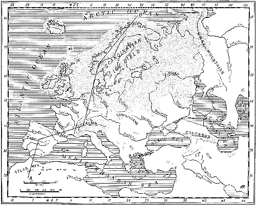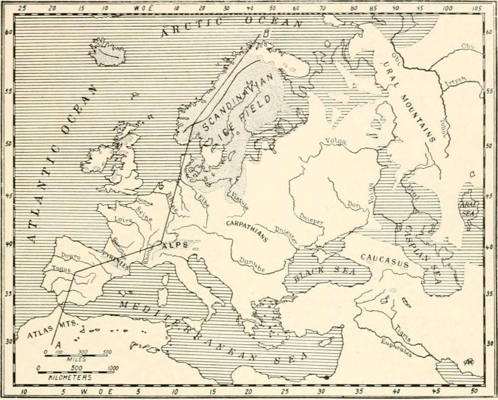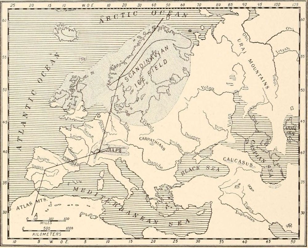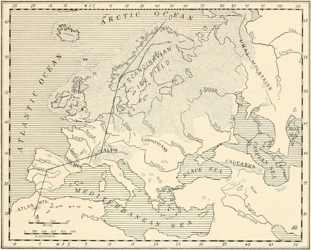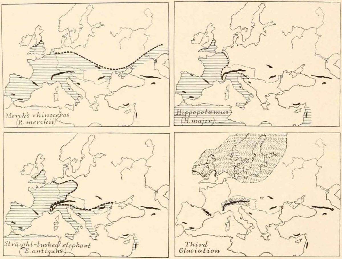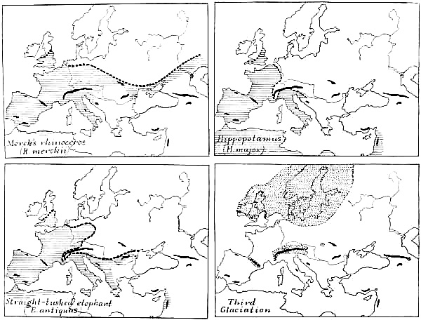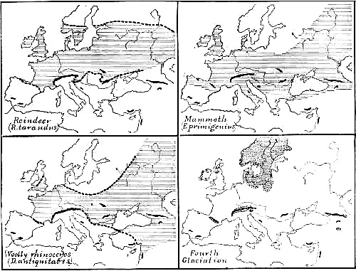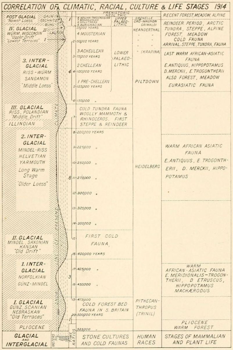 In the study of the divisions, duration, and fluctuations of climate during the Old Stone Age I have been assisted chiefly by Doctor Chester A. Reeds, a geologist of the American Museum, who devoted two months to bringing together in a comprehensive and intelligible form the results of the great researches of Albrecht Penck and Eduard Brückner embraced in the three-volume work, Die Alpen im Eiszeitalter. The temperatures and snow-levels of the Glacial Epoch, which is contemporaneous with the Old Stone Age, together with the successive phases of mammalian life which they conditioned, afford the firm basis of our chronology; that is, we must reckon the grand divisions of past time in terms of Glacial and Interglacial Stages; the subdivisions are recorded in terms of the human invention and progress of the flint industry. I have also had frequent recourse to The Great Ice Age and the more recent Antiquity of Man in Europe of James Geikie, the founder of the modern theory of the multiple Ice Age in Europe.