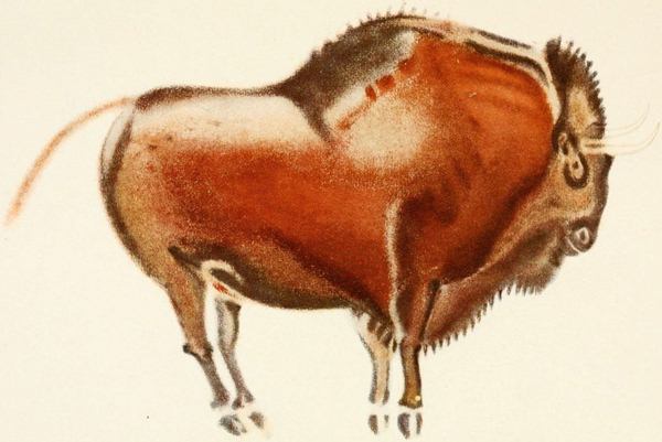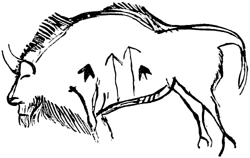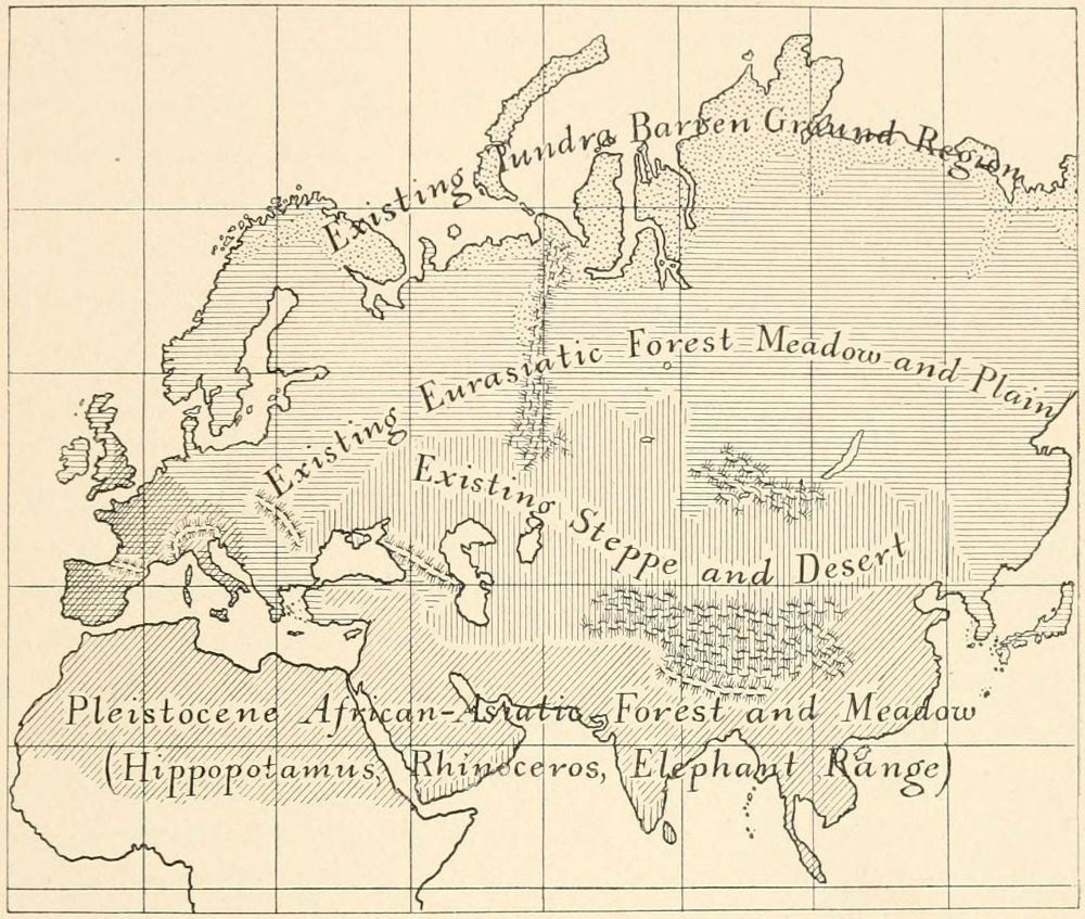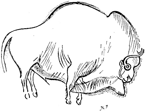 [M] Bison and wild cattle are grass eaters, and their natural habitats are the open plain and meadow regions. They also range into open forest lands where grasses can be found. The prehistoric 'urus' and 'wisent' of Europe were both found in forests, but this may not have been their natural habitat in Palæolithic times. See Appendix, Note IV.