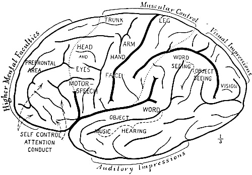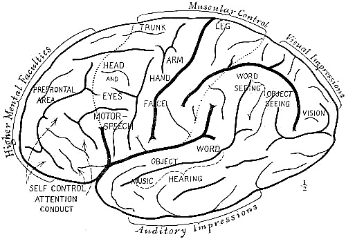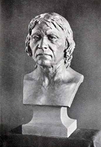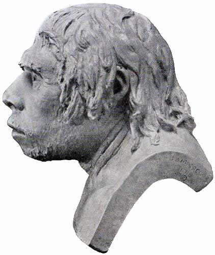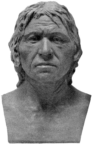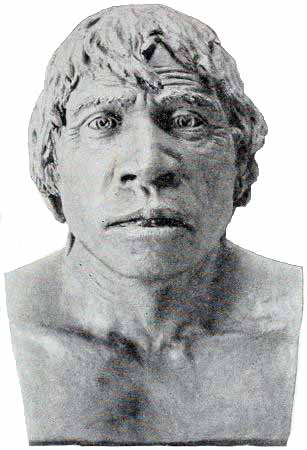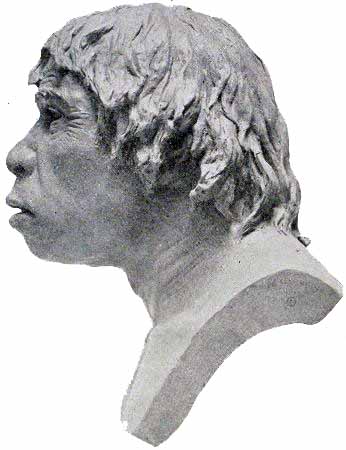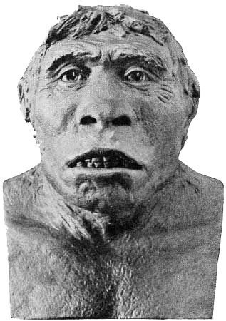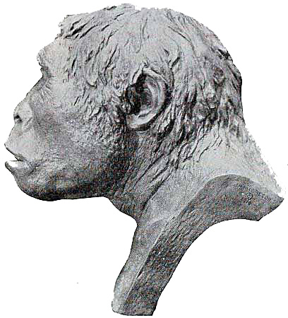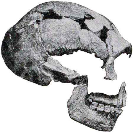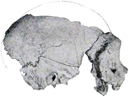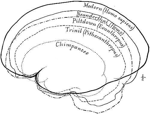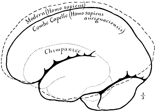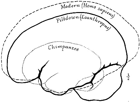 [AB] The reconstruction (Fig. 66) of the Piltdown skull made by Professor J. H. McGregor has a cranial capacity of about 1300 c.cm. The brain (Fig. 70) is seen to be very narrow and low in the prefrontal area, the seat of the higher mental faculties. In the reconstruction the cranial region is in the main very like the second restoration by Doctor Smith Woodward, but the jaws differ in some respects. The tooth hitherto regarded as a right lower canine, is now placed as the left upper canine, in accord with the conclusions of the author of this work and of Doctors Matthew and Gregory of the American Museum of Natural History. The dental arches are more curved, thus more human and less ape-like than in the Smith Woodward restoration, and the chin region is made somewhat deeper, thus giving a somewhat less prognathous aspect to the face.