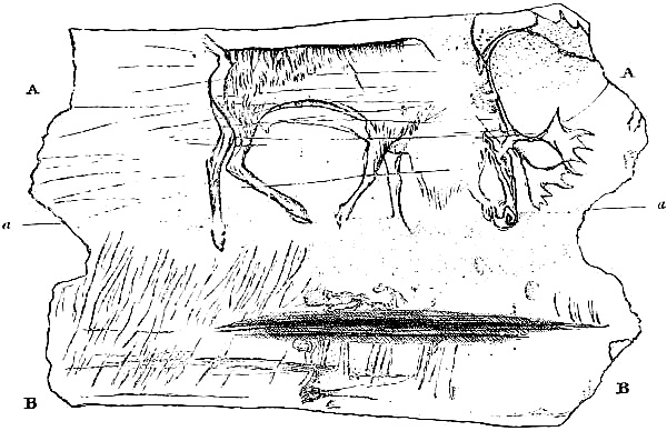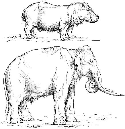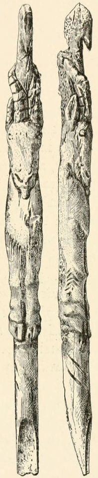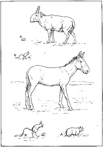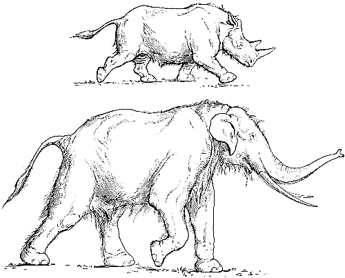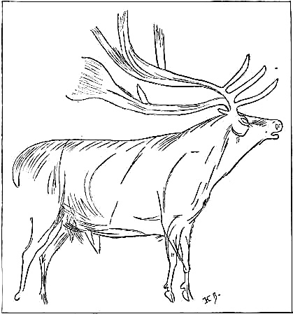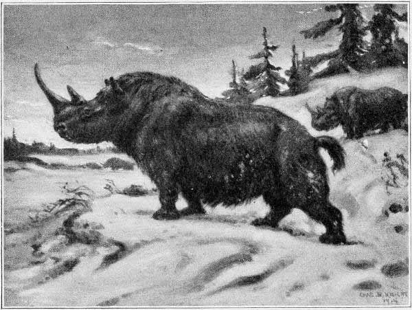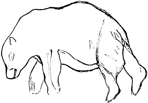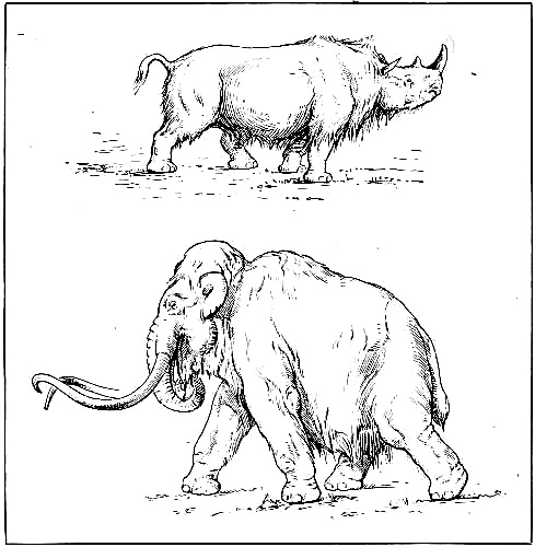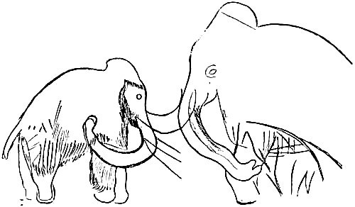 [AC] The early Teutonic designation of these animals was as follows: bison, 'wisent,' wild ox, 'auerochs,' 'urochs' (the 'urus' of Cæsar). The urus survived in Germany as late as the seventeenth century, while a few of the bison or 'wisent' survive to the present time. The bison was distinctively a short-headed animal, while its contemporary, the urus, was long-headed and less agile. At Dürnten, near Zürich, remains of the urus are found associated with those of the hardy, straight-tusked elephant and of Merck's rhinoceros. (See Appendix, Note IV.)