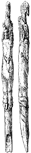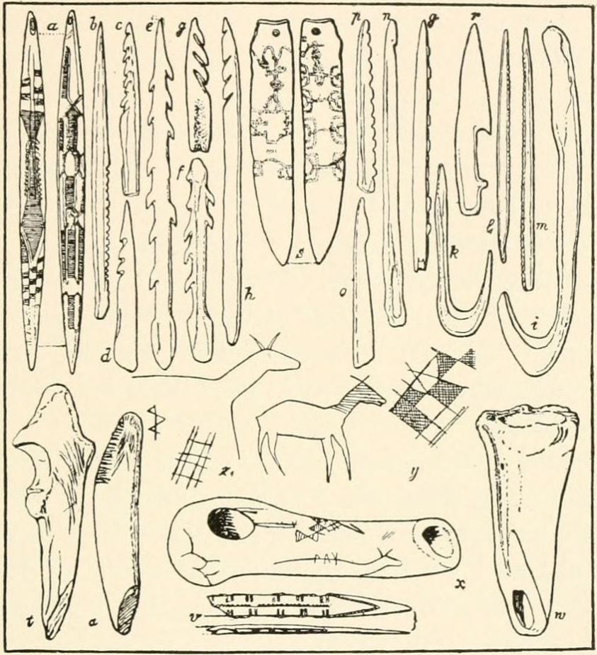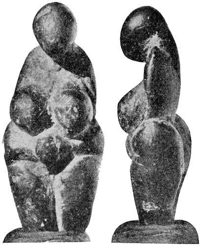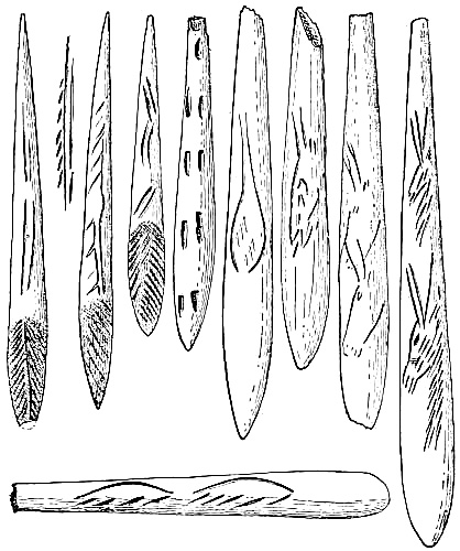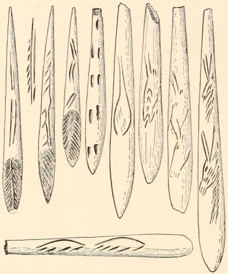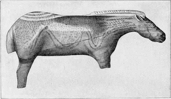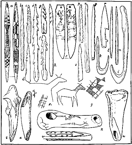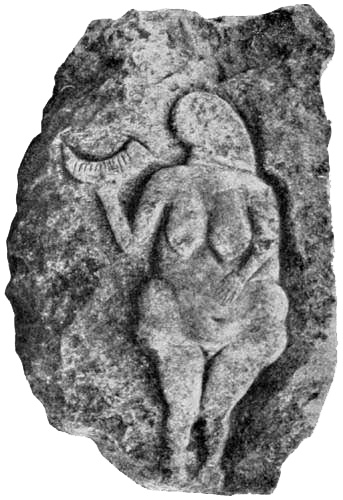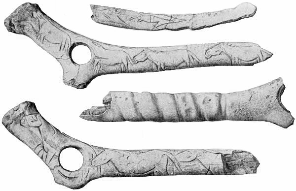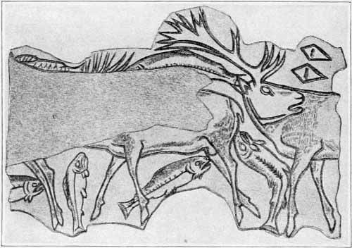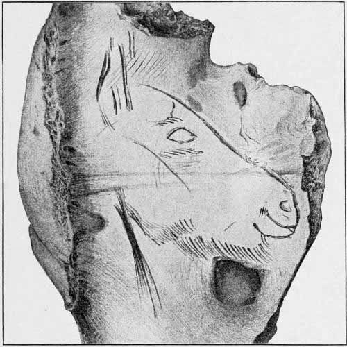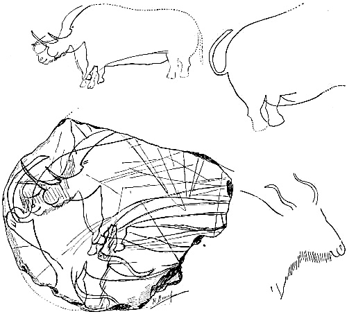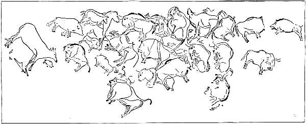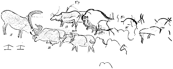 [AX] The whole history of these successive discoveries, beginning with the finding of an engraved bone, in 1834, in the grotto of Chaffaud, and concluding with the discoveries of Lalanne, and of Bégouen, in 1912, is summarized in the admirable little handbook by Salomon Reinach.(23) This convenient volume also includes outline tracings of the more important drawings and sculptures found in western Europe up to the present time.
