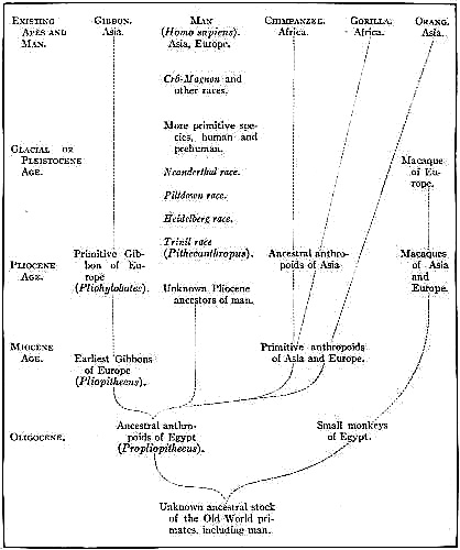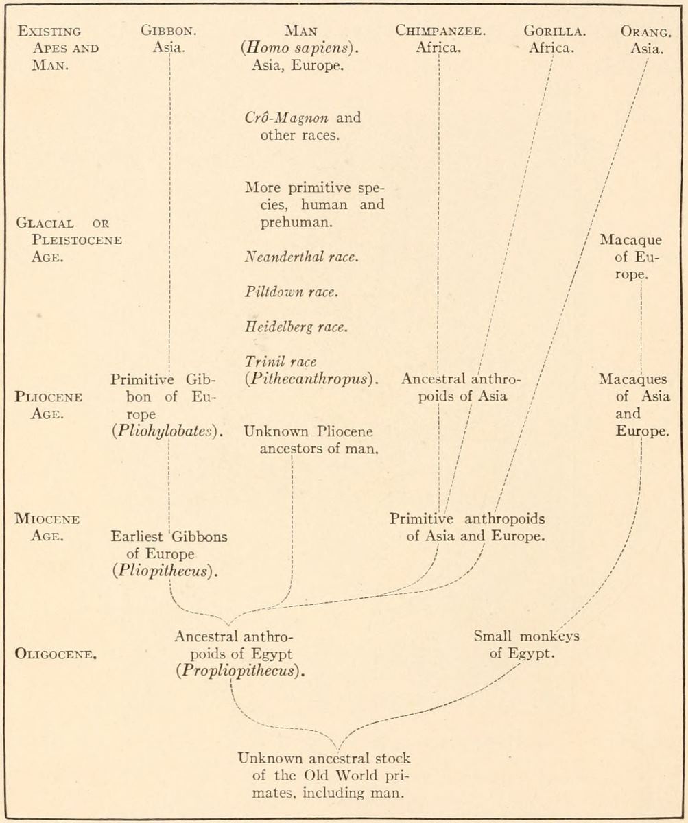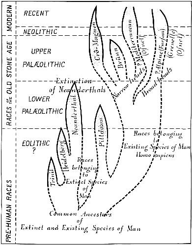 The attempt to place this long chapter of prehistory on a historical basis has many dangers, of which I am fully aware. After weighing the evidence presented by the eminent authorities in these various branches of science, I have presented my conclusions in very definite and positive form rather than in vague or general terms, believing that a positive statement has at least the merit of being positively supported or rebutted by fresh evidence. For example, I have placed the famous Piltdown man, Eoanthropus, in a comparatively recent stage of geologic time, an entirely opposite conclusion to that reached by Doctor A. Smith [Pg ix]Woodward, who has taken a leading part in the discovery of this famous race and has concurred with other British geologists in placing it in early Pleistocene times. The difference between early and late Pleistocene times is not a matter of thousands but of hundreds of thousands of years; if so advanced a stage as the Piltdown man should definitely occur in the early Pleistocene, we may well expect to discover man in the Pliocene; on the contrary, in my opinion even in late Pliocene times man had only reached a stage similar to the Pithecanthropus, or prehuman Trinil race of Java; in other words, according to my view, man as such chiefly evolved during the half million years of the Pleistocene Epoch and not during the Pliocene.