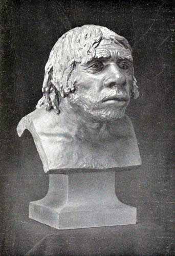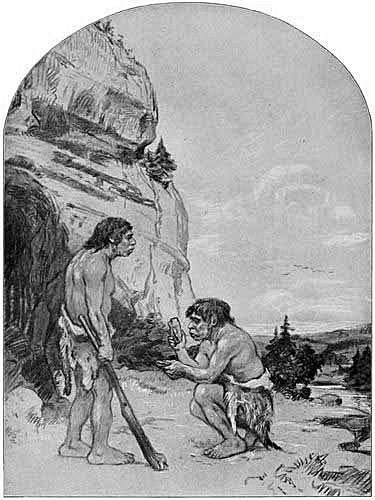 Pl. I. Neanderthal man at the station of Le Moustier, overlooking the valley of the Vézère, Dordogne. Drawing by Charles R. Knight, under the direction of the author.
