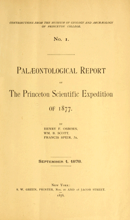 The fossils collected by the Palæontological party, and deposited by the chief of the expedition in the Geological Museum, consisted of two sets, one numbering some two thousand specimens of fossil plants and insects from the tertiary beds of Central Colorado, the other of a considerable series of fossil vertebrates, mostly mammals, from the tertiary beds of Wyoming Territory, around Fort Bridger. This last collection has been studied and worked out with unabated zeal and diligence by the three post-graduate members of the Palæontological party, Messrs. H. Osborn, W. Scott, and F. Speir, who devoted most of the time of their course to this special work, with what success this Report will show.