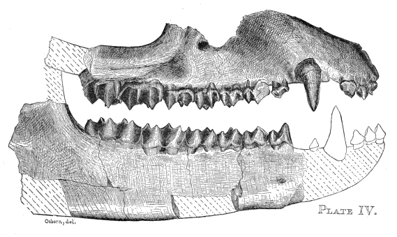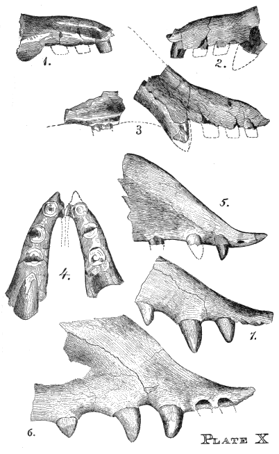 "Dental formula of the inferior series: I. 2, C. 2, Pm. 4, M. 3. The last molar has an expanded heel. The third premolar consists of a cone with posterior heel. Fourth premolar exhibits, besides its principal cone, an interior lateral one and a large heel. The true molars support two anterior tubercles, of which the inner is represented by two distinct cusps in one or more of them, and the external is crescentoid in section. The posterior part of the crown is wide and concave, and bordered at its posterior angles by an obsolete tubercle on the inner, and an elevated angle on the outer side." (Palæontology, Wheeler's Survey, iv (pt. 2), p. 135.)