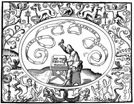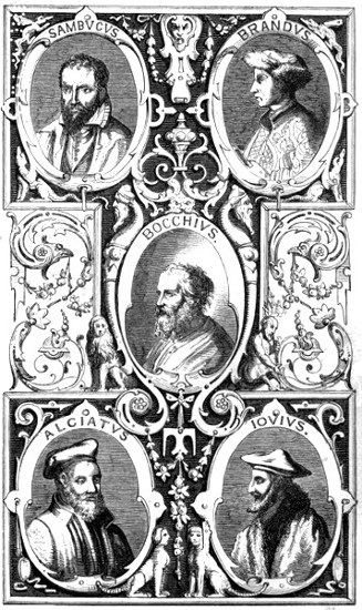 As a suitable Frontispiece the portraits are presented of five celebrated authors of the fifteenth and sixteenth centuries: one a German—Sebastian Brandt; three Italian—Andrew Alciat, Paolo Giovio, and Achilles Bocchius; and one from Hungary—John Sambucus. They were all men of learning and renown, whom kings and emperors honoured, and whom the foremost of their age admired. The central portrait, that of Bocchius of Bologna, is from the famous artist Giulio Bonasone, and the original engraving was retouched by Augustino Caracci. The other portraits have been reduced from the “Icones,” or Figures of Fifty Illustrious Men, which Theodore de Bry executed and published during Shakespeare’s prime, in 1597. In their own day they were regarded as correct delineations and likenesses, and are said to be authentic copies.