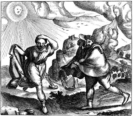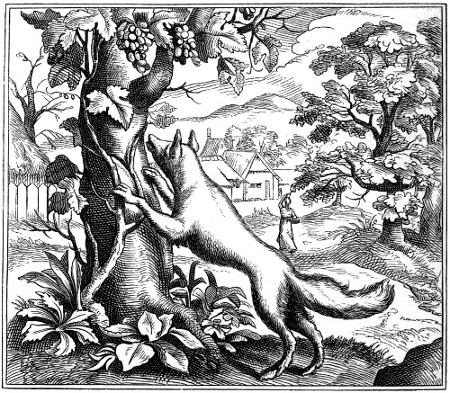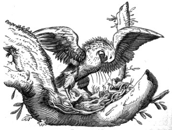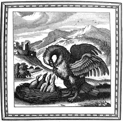 145. See the French version of Æsop, with 150 beautiful vignettes, “Les Fables et la Vie d’Esope:” “A Anvers En l’imprimerie Plantiniēne Chez la Vefue, & Jean Mourentorf, M.D.XCIII.” Here the bird is a jay (see p. 117, Du Gay, xxxi); and the peacocks are the avengers upon the base pretender to glories not his own.