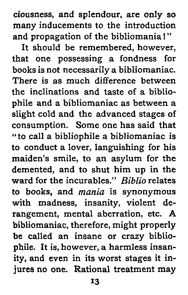 Peignot says a bibliomaniac is one who has "a passion for possessing[24] books; not so much to be instructed by them as to gratify the eye by looking on them." This presumption is about as reasonable as it would be to say that a man is a monomaniac because he gets married when he is in no special need of a house-servant, or body-guard.