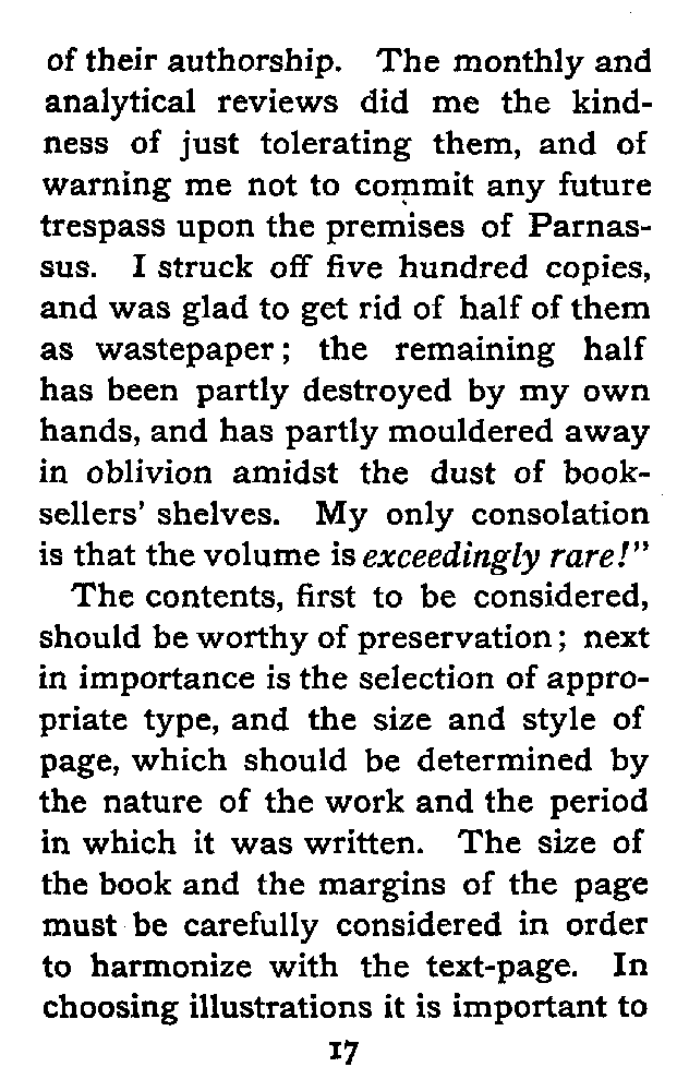 There are several species of bibliophiles; there are many species of bibliomaniacs. Some admire books for what they contain; others for their beautiful type, hand-made paper, artistic illustrations, ample margins, untrimmed[16] edges, etc.; and there are others who attach more importance to the limited number of copies issued than to either the contents or workmanship.