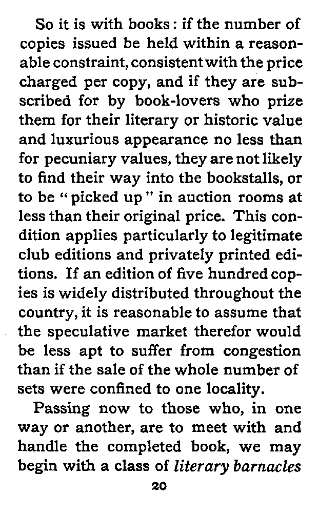 So it is with books: if the number of copies issued be held within a reasonable constraint, consistent with the price charged per copy, and if they are subscribed for by book-lovers who prize them for their literary or historic value and luxurious appearance no less than for pecuniary values, they are not likely to find their way into the bookstalls, or to be "picked up" in auction rooms at less than their original price. This condition applies particularly to legitimate club editions and privately printed editions. If an edition of five hundred copies is widely distributed throughout the country, it is reasonable to assume that the speculative market therefor would be less apt to suffer from congestion than if the sale of the whole number of sets were confined to one locality.