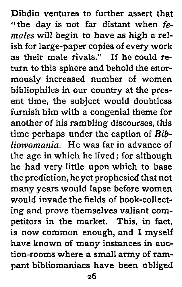 Dibdin ventures to further assert that "the day is not far distant when females will begin to have as high a relish for large-paper copies of every work as their male rivals." If he could return to this sphere and behold the enormously increased number of women bibliophiles in our country at the present time, the subject would doubtless furnish him with a congenial theme for another of his rambling discourses, this time perhaps under the caption of Bibliowomania. He was far in advance of the age in which he lived; for although he had very little upon which to base the prediction, he yet prophesied that not many years would lapse before women would invade the fields of book-collecting and prove themselves valiant competitors in the market. This, in fact, is now common enough, and I myself have known of many instances in auction-rooms where a small army of rampant bibliomaniacs have been obliged[27] to retreat and to abandon their pursuit of some coveted treasure, on finding it boldly covered by a carte-blanche order from a feminine competitor. Women rarely appear in the book auction-room, but leave their orders to be executed through a trusted broker, and many a collector has found himself suddenly obliged to soar aloft to dizzy heights in quest of some prize, on being thus lifted and pursued by one of the representatives of an unseen and unknown member of the gentler sex.