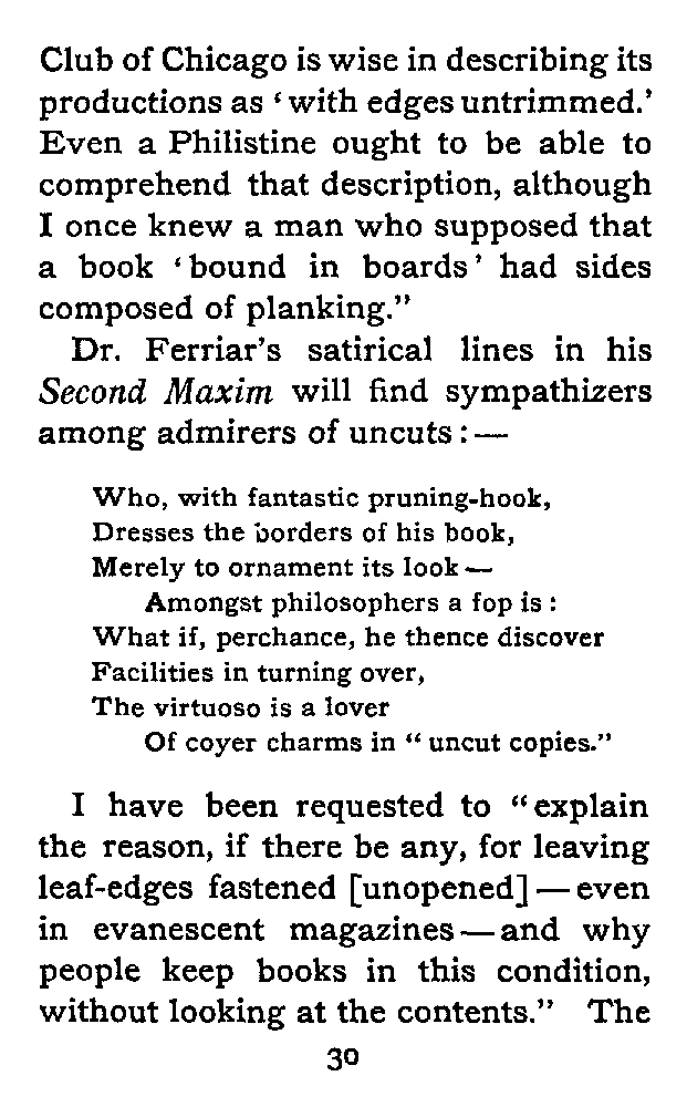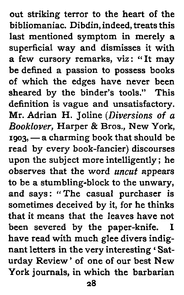 Many people suppose the term "uncut," characteristic of Dibdin's second "symptom," to signify that the leaves of such volume as may be concerned have never been severed, whether for convenience of reading or otherwise. "Uncut," however, in its technical sense does not imply that the sheets are folded and bound just as they came from the press. The leaves may all be cut, and the tops trimmed, and even gilded, without[28] striking terror to the heart of the bibliomaniac. Dibdin, indeed, treats this last mentioned symptom in merely a superficial way and dismisses it with a few cursory remarks, viz: "It may be defined a passion to possess books of which the edges have never been sheared by the binder's tools." This definition is vague and unsatisfactory. Mr. Adrian H. Joline (Diversions of a Booklover, Harper & Bros., New York, 1903,—a charming book that should be read by every book-fancier) discourses upon the subject more intelligently; he observes that the word uncut appears to be a stumbling-block to the unwary, and says: "The casual purchaser is sometimes deceived by it, for he thinks that it means that the leaves have not been severed by the paper-knife. I have read with much glee divers indignant letters in the very interesting 'Saturday Review' of one of our best New York journals, in which the barbarian[29] writers have denounced the uncut, and have assailed in vigorous but misguided phrases those who prefer to have their books in that condition. Henry Stevens tells us that even such a famous collector as James Lenox, founder of the splendid library into whose magnificent mysteries so few of us dare to penetrate, was misled by the word uncut, and chided Stevens for buying an uncut book whose pages were all open. He says: 'Again when his tastes had grown into the mysteries of uncut leaves, he returned a very rare, early New England tract, expensively bound, because it did not answer the description of uncut in the invoice, for the leaves had manifestly been cut open and read.' When it was explained to him that in England the term uncut signified only that the edges were not trimmed, he shelved the rarity with the remark that he 'learned something every day.' . . . Perhaps the Caxton[30] Club of Chicago is wise in describing its productions as 'with edges untrimmed.' Even a Philistine ought to be able to comprehend that description, although I once knew a man who supposed that a book 'bound in boards' had sides composed of planking."