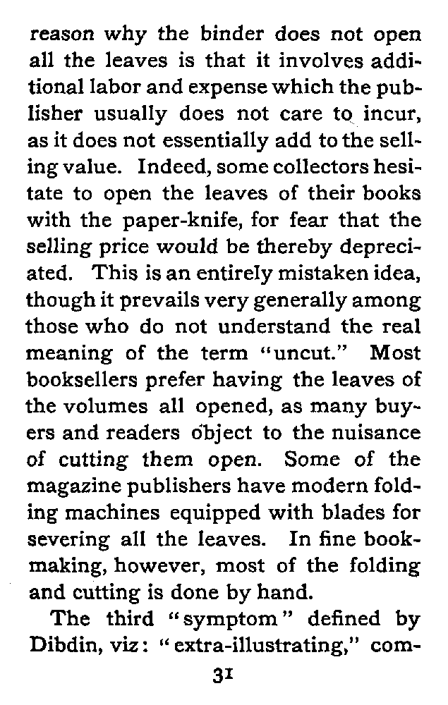I have been requested to "explain the reason, if there be any, for leaving leaf-edges fastened [unopened]—even in evanescent magazines—and why people keep books in this condition, without looking at the contents." The[31] reason why the binder does not open all the leaves is that it involves additional labor and expense which the publisher usually does not care to incur, as it does not essentially add to the selling value. Indeed, some collectors hesitate to open the leaves of their books with the paper-knife, for fear that the selling price would be thereby depreciated. This is an entirely mistaken idea, though it prevails very generally among those who do not understand the real meaning of the term "uncut." Most booksellers prefer having the leaves of the volumes all opened, as many buyers and readers object to the nuisance of cutting them open. Some of the magazine publishers have modern folding machines equipped with blades for severing all the leaves. In fine book-making, however, most of the folding and cutting is done by hand.