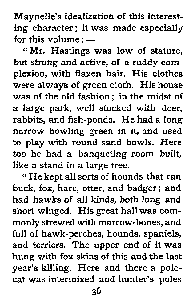 "Mr. Hastings was low of stature, but strong and active, of a ruddy complexion, with flaxen hair. His clothes were always of green cloth. His house was of the old fashion; in the midst of a large park, well stocked with deer, rabbits, and fish-ponds. He had a long narrow bowling green in it, and used to play with round sand bowls. Here too he had a banqueting room built, like a stand in a large tree.