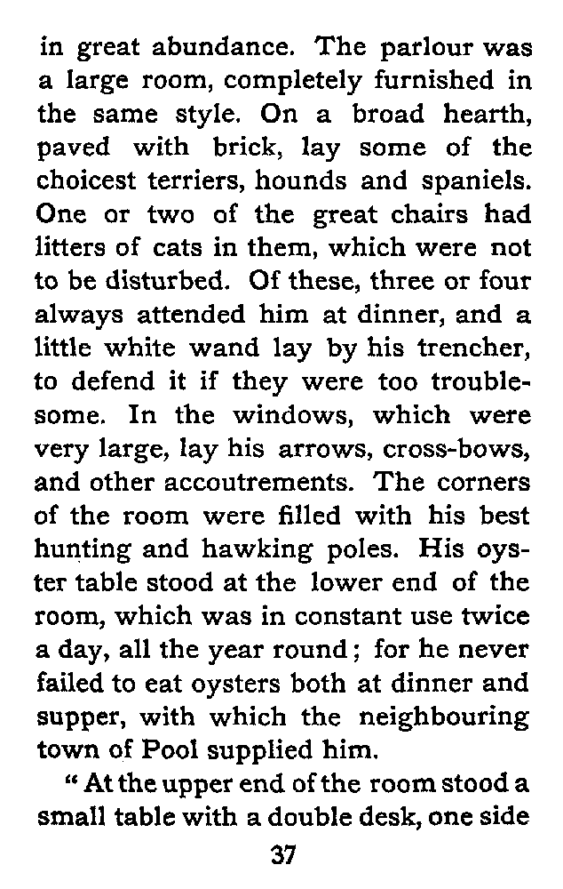 "He kept all sorts of hounds that ran buck, fox, hare, otter, and badger; and had hawks of all kinds, both long and short winged. His great hall was commonly strewed with marrow-bones, and full of hawk-perches, hounds, spaniels, and terriers. The upper end of it was hung with fox-skins of this and the last year's killing. Here and there a polecat was intermixed and hunter's poles[37] in great abundance. The parlour was a large room, completely furnished in the same style. On a broad hearth, paved with brick, lay some of the choicest terriers, hounds and spaniels. One or two of the great chairs had litters of cats in them, which were not to be disturbed. Of these, three or four always attended him at dinner, and a little white wand lay by his trencher, to defend it if they were too troublesome. In the windows, which were very large, lay his arrows, cross-bows, and other accoutrements. The corners of the room were filled with his best hunting and hawking poles. His oyster table stood at the lower end of the room, which was in constant use twice a day, all the year round; for he never failed to eat oysters both at dinner and supper, with which the neighbouring town of Pool supplied him.