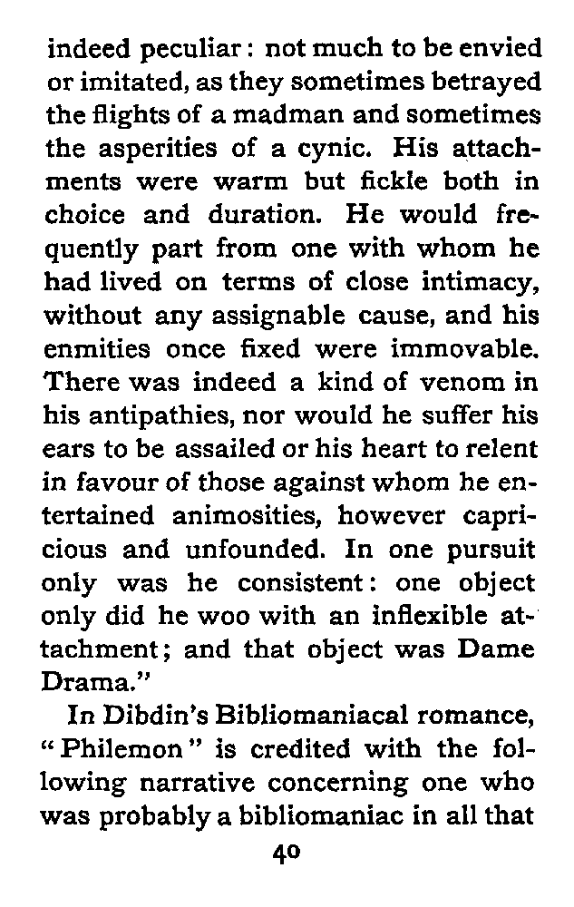 In Dibdin's Bibliomaniacal romance, "Philemon" is credited with the following narrative concerning one who was probably a bibliomaniac in all that[41] the compound sense of the term implies:—
