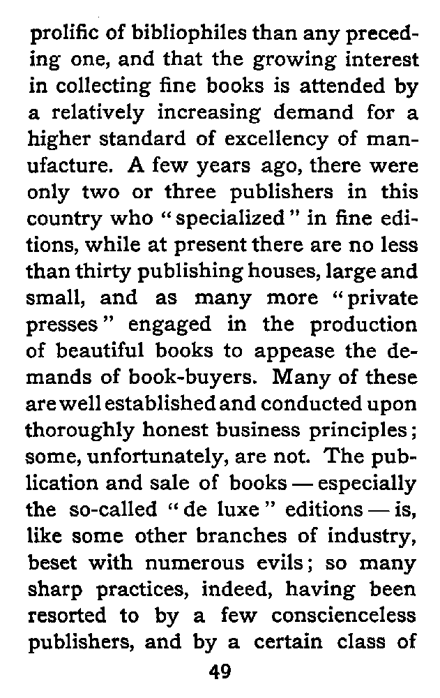 To return, however, to the subject more immediately in hand, it will be observed that the present age is more[49] prolific of bibliophiles than any preceding one, and that the growing interest in collecting fine books is attended by a relatively increasing demand for a higher standard of excellency of manufacture. A few years ago, there were only two or three publishers in this country who "specialized" in fine editions, while at present there are no less than thirty publishing houses, large and small, and as many more "private presses" engaged in the production of beautiful books to appease the demands of book-buyers. Many of these are well established and conducted upon thoroughly honest business principles; some, unfortunately, are not. The publication and sale of books—especially the so-called "de luxe" editions—is, like some other branches of industry, beset with numerous evils; so many sharp practices, indeed, having been resorted to by a few conscienceless publishers, and by a certain class of[50] unscrupulous agents, that buyers have become wary, not to say weary, of being made the victims of their deceptive inventions. It is indeed lamentable that a few such pestiferous schemers should thus bring a certain degree of reproach upon the entire publishing business. It is a common practice among these soi-disant publishers—many of whom possess neither capital, credit, nor sense of honor—to buy some lot of etchings or old prints from a junk-shop, or second-hand dealer, at a trifling price, and thereupon work the same off on credulous admirers of rare prints for possibly a thousand times their real value. And it is a common practice for these insidious sharks further to prey upon unsuspecting book-buyers by obtaining publications of reputable houses and falsifying them by the insertion of spurious titles calculated to delude the buyer into the belief that there are "only fifty copies issued." Many of them are ostracized[51] book-salesmen who have at some previous time enjoyed the confidence of their employers, but have been ex-communicated by all honest publishers and booksellers on account of dishonest proclivities. They are therefore set adrift to prey upon the public, and are a constant menace to both publishers and buyers. I shall pay my further respects to these counterfeiters later on when I come to the subject of Book Clubs; in the mean while, it need hardly be pointed out that reprehensible methods of this kind are uniformly condemned among all respectable publishers and book-dealers, and that buyers should cautiously discriminate against those who practice them. It is not surprising that even the honest publishers and dealers themselves are occasionally made the scapegoats of these obnoxious parasites; but the astute collector is rarely "caught" by their schemes; and after a book-buyer has[52] passed the primary or "experience" stages of book-collecting, he (or she) is designated as a "dead one," in the common parlance of the underground trade here referred to. Fortunate, indeed, are the bibliophiles who have passed unscathed into the category of "dead ones."