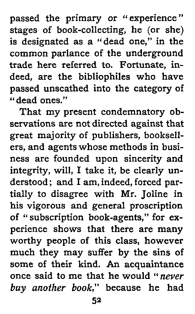 That my present condemnatory observations are not directed against that great majority of publishers, booksellers, and agents whose methods in business are founded upon sincerity and integrity, will, I take it, be clearly understood; and I am, indeed, forced partially to disagree with Mr. Joline in his vigorous and general proscription of "subscription book-agents," for experience shows that there are many worthy people of this class, however much they may suffer by the sins of some of their kind. An acquaintance once said to me that he would "never buy another book," because he had[53] been "buncoed" by a book-agent, to whom he otherwise referred with an uncomplimentary adjective. But this did not convince me that his position was more logical than that of the man who declared he would never take another bath because a watch had been stolen from his pocket while he was in bathing at some beach resort. It is incomprehensible that any one could imagine that our paper currency system is fraudulent because there are a few "green-goods" men in the country, or because counterfeit bills appear every now and then.