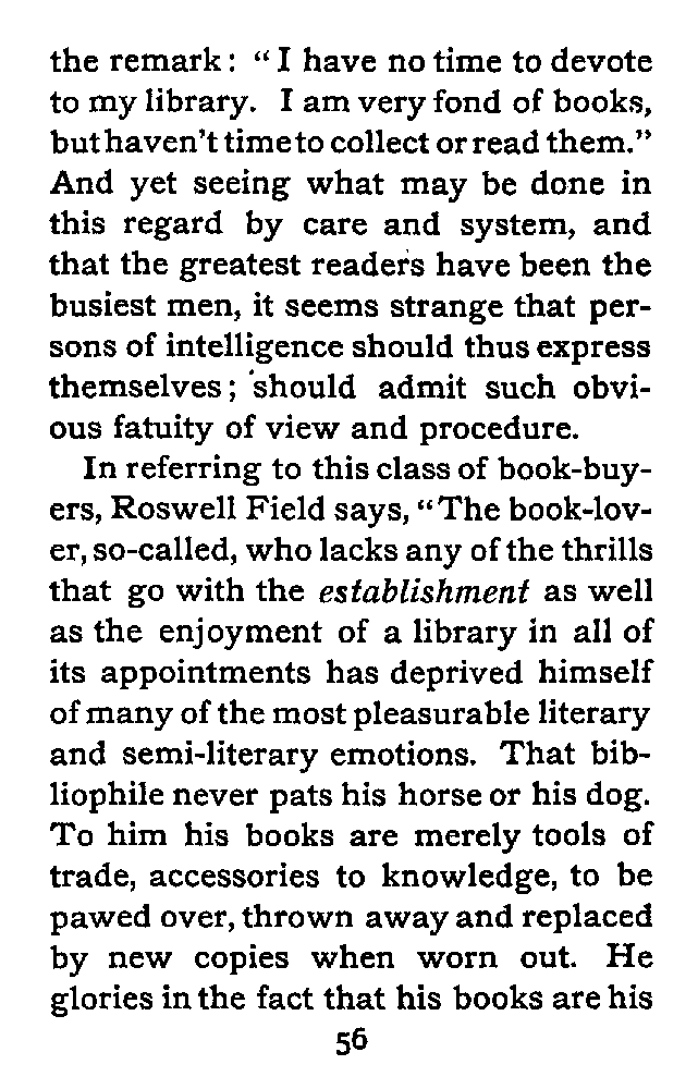 In referring to this class of book-buyers, Roswell Field says, "The book-lover, so-called, who lacks any of the thrills that go with the establishment as well as the enjoyment of a library in all of its appointments has deprived himself of many of the most pleasurable literary and semi-literary emotions. That bibliophile never pats his horse or his dog. To him his books are merely tools of trade, accessories to knowledge, to be pawed over, thrown away and replaced by new copies when worn out. He glories in the fact that his books are his[57] servants rather than his companions, and he affects to despise and laugh at the sentimental relation which others have established with their books. Look out for that man! He is not of us; he is not of the elect; there is as little of warmth and the genial glow of fellowship in his library as in the middle gallery of the catacombs in the Appian Way. His very books cry out against him; but he hears them not, for he is deaf as well as blind."