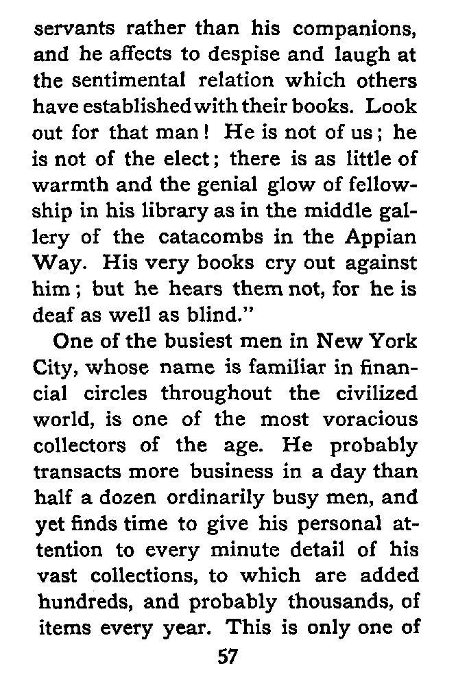 One of the busiest men in New York City, whose name is familiar in financial circles throughout the civilized world, is one of the most voracious collectors of the age. He probably transacts more business in a day than half a dozen ordinarily busy men, and yet finds time to give his personal attention to every minute detail of his vast collections, to which are added hundreds, and probably thousands, of items every year. This is only one of[58] many such examples among our busiest men.