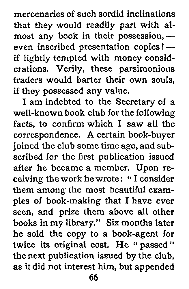 I am indebted to the Secretary of a well-known book club for the following facts, to confirm which I saw all the correspondence. A certain book-buyer joined the club some time ago, and subscribed for the first publication issued after he became a member. Upon receiving the work he wrote: "I consider them among the most beautiful examples of book-making that I have ever seen, and prize them above all other books in my library." Six months later he sold the copy to a book-agent for twice its original cost. He "passed" the next publication issued by the club, as it did not interest him, but appended[67] a postscript to his letter, saying: "If any member wants an extra copy, I have no objection to one being issued upon my membership and turned over to him, provided I receive the increase in price."
