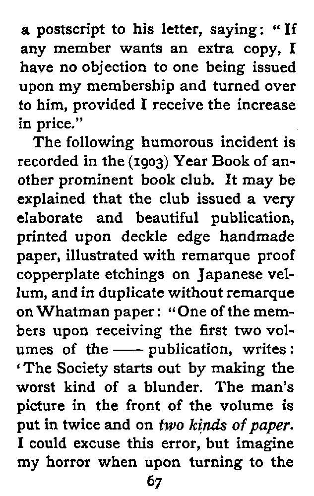 The following humorous incident is recorded in the (1903) Year Book of another prominent book club. It may be explained that the club issued a very elaborate and beautiful publication, printed upon deckle edge handmade paper, illustrated with remarque proof copperplate etchings on Japanese vellum, and in duplicate without remarque on Whatman paper: "One of the members upon receiving the first two volumes of the —— publication, writes: 'The Society starts out by making the worst kind of a blunder. The man's picture in the front of the volume is put in twice and on two kinds of paper. I could excuse this error, but imagine my horror when upon turning to the[68] back of the volume I found the same mistake repeated. This is too much.' He closed by expressing a desire to resign, saying that he did not know he 'was joining a faddists club,' and takes occasion to remark further that 'the books are cheaply finished, not even being trimmed and gilded;' also that he 'can buy better books in the stores, with full gilt edges, for less money.'"