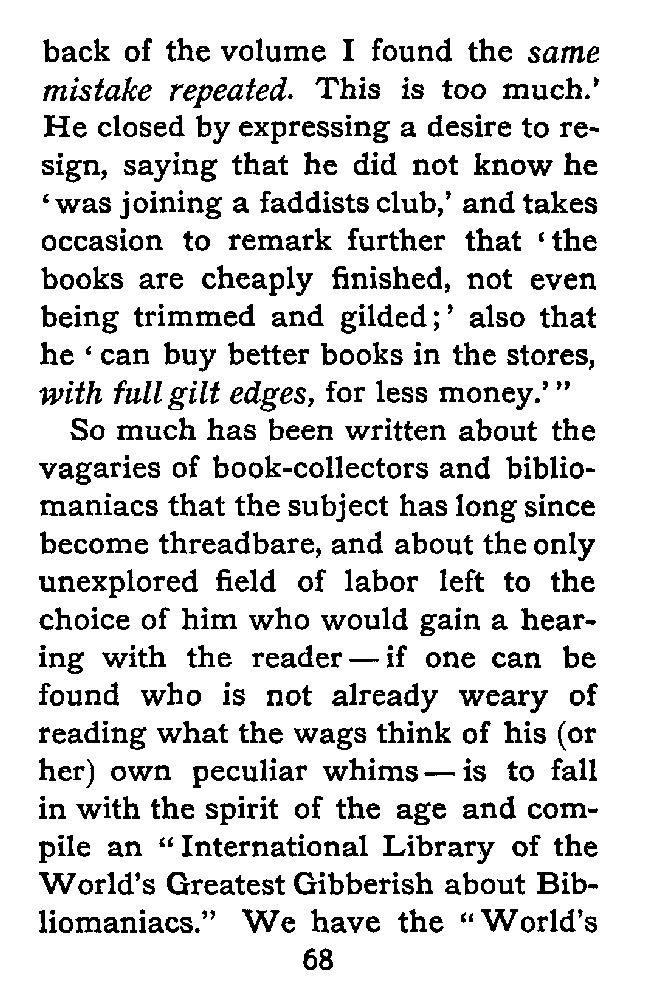 So much has been written about the vagaries of book-collectors and bibliomaniacs that the subject has long since become threadbare, and about the only unexplored field of labor left to the choice of him who would gain a hearing with the reader—if one can be found who is not already weary of reading what the wags think of his (or her) own peculiar whims—is to fall in with the spirit of the age and compile an "International Library of the World's Greatest Gibberish about Bibliomaniacs." We have the "World's[69] Greatest" everything else in book-lore, and I shall not be surprised if some enterprising publisher gets out a "definitive" de luxe edition of the "World's Greatest Dictionaries." Indeed, the Holy Bible itself has not escaped, for they are now making a "de luxe" edition, in fourteen volumes! to be sold by subscription. It will not be an "Autograph Edition," however.