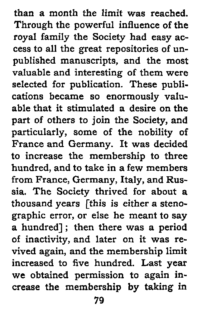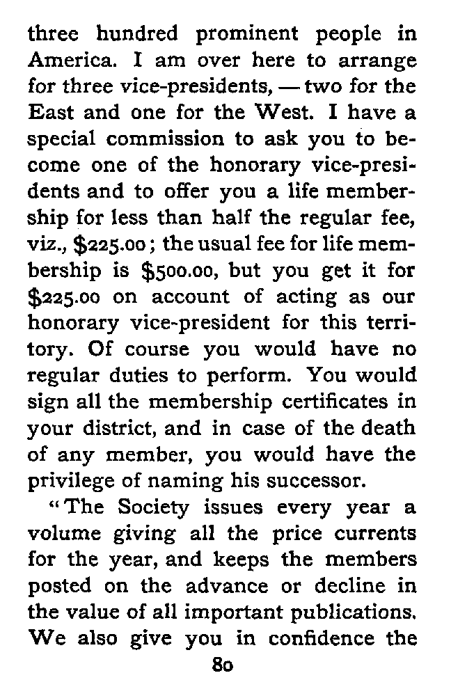 "I am the Treasurer of the —— Society, with headquarters in London. By a special grant from the English Government, we have recently been permitted to extend our membership into this country, and three hundred life members are to be admitted under this enlargement of our constitutional privileges. It may interest you, first, to know something of the origin of this Society. It was organized in London about three hundred years ago by the Duke of Roxburghe [who was not born until more than a hundred years later], and was originally composed of about thirty members of the royal family. The original charter limited the membership to fifty members, and in less[79] than a month the limit was reached. Through the powerful influence of the royal family the Society had easy access to all the great repositories of unpublished manuscripts, and the most valuable and interesting of them were selected for publication. These publications became so enormously valuable that it stimulated a desire on the part of others to join the Society, and particularly, some of the nobility of France and Germany. It was decided to increase the membership to three hundred, and to take in a few members from France, Germany, Italy, and Russia. The Society thrived for about a thousand years [this is either a stenographic error, or else he meant to say a hundred]; then there was a period of inactivity, and later on it was revived again, and the membership limit increased to five hundred. Last year we obtained permission to again increase the membership by taking in[80] three hundred prominent people in America. I am over here to arrange for three vice-presidents,—two for the East and one for the West. I have a special commission to ask you to become one of the honorary vice-presidents and to offer you a life membership for less than half the regular fee, viz., $225.00; the usual fee for life membership is $500.00, but you get it for $225.00 on account of acting as our honorary vice-president for this territory. Of course you would have no regular duties to perform. You would sign all the membership certificates in your district, and in case of the death of any member, you would have the privilege of naming his successor.
