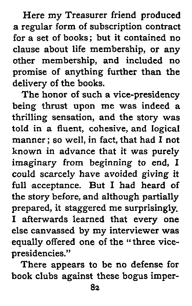 "The Society issues every year a volume giving all the price currents for the year, and keeps the members posted on the advance or decline in the value of all important publications. We also give you in confidence the[81] ratings of various publishers, and print reports to members exposing all the frauds in the book business. Upon payment of the fee of $225.00, you receive all of this material free, for the balance of your life, and in addition all of the Society's regular publications, including the present one, consisting of —— volumes [here he produced the customary specimen sheets]. You see this one work alone is worth the full amount you pay for life membership [here occurred a "special offer" of some sort, given in a low monotone which the stenographer was unable to hear; and I must confess that I was so stupefied by this astounding fabrication that I myself have not the faintest recollection of what this "special offer" consisted]. We are very anxious to have your name as our honorary vice-president here, because you will not only be an honor to the Society, but the Society will be an honor to you."[82]