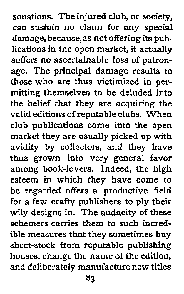 There appears to be no defense for book clubs against these bogus impersonations.[83] The injured club, or society, can sustain no claim for any special damage, because, as not offering its publications in the open market, it actually suffers no ascertainable loss of patronage. The principal damage results to those who are thus victimized in permitting themselves to be deluded into the belief that they are acquiring the valid editions of reputable clubs. When club publications come into the open market they are usually picked up with avidity by collectors, and they have thus grown into very general favor among book-lovers. Indeed, the high esteem in which they have come to be regarded offers a productive field for a few crafty publishers to ply their wily designs in. The audacity of these schemers carries them to such incredible measures that they sometimes buy sheet-stock from reputable publishing houses, change the name of the edition, and deliberately manufacture new titles[84] on which they print the name of some book club or society. These counterfeits are sold to the unsuspecting book-buyer, who often imagines he has landed a prize. Later, he is likely to become disillusioned. There can be no doubt that the contemptible practice of thus mutilating and garbling books should be defined as a felony and made punishable by fine or imprisonment. Book-buyers, however, can in a measure help the situation and protect themselves by not dealing with such people; they should particularly remember that creditable book clubs never employ soliciting agents, and rarely, if ever, offer their publications for sale outside of the membership. Any one, therefore, representing himself as an authorized agent of a book club may usually be branded as an impostor. Most book clubs print only such number of copies of each publication as are subscribed and paid for by members in advance, and the[85] funds thus advanced are used to pay the cost of the edition.