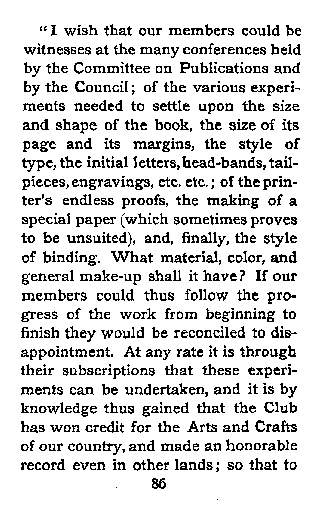 "I wish that our members could be witnesses at the many conferences held by the Committee on Publications and by the Council; of the various experiments needed to settle upon the size and shape of the book, the size of its page and its margins, the style of type, the initial letters, head-bands, tail-pieces, engravings, etc. etc.; of the printer's endless proofs, the making of a special paper (which sometimes proves to be unsuited), and, finally, the style of binding. What material, color, and general make-up shall it have? If our members could thus follow the progress of the work from beginning to finish they would be reconciled to disappointment. At any rate it is through their subscriptions that these experiments can be undertaken, and it is by knowledge thus gained that the Club has won credit for the Arts and Crafts of our country, and made an honorable record even in other lands; so that to[87] be a member of the Club has become an enviable distinction."