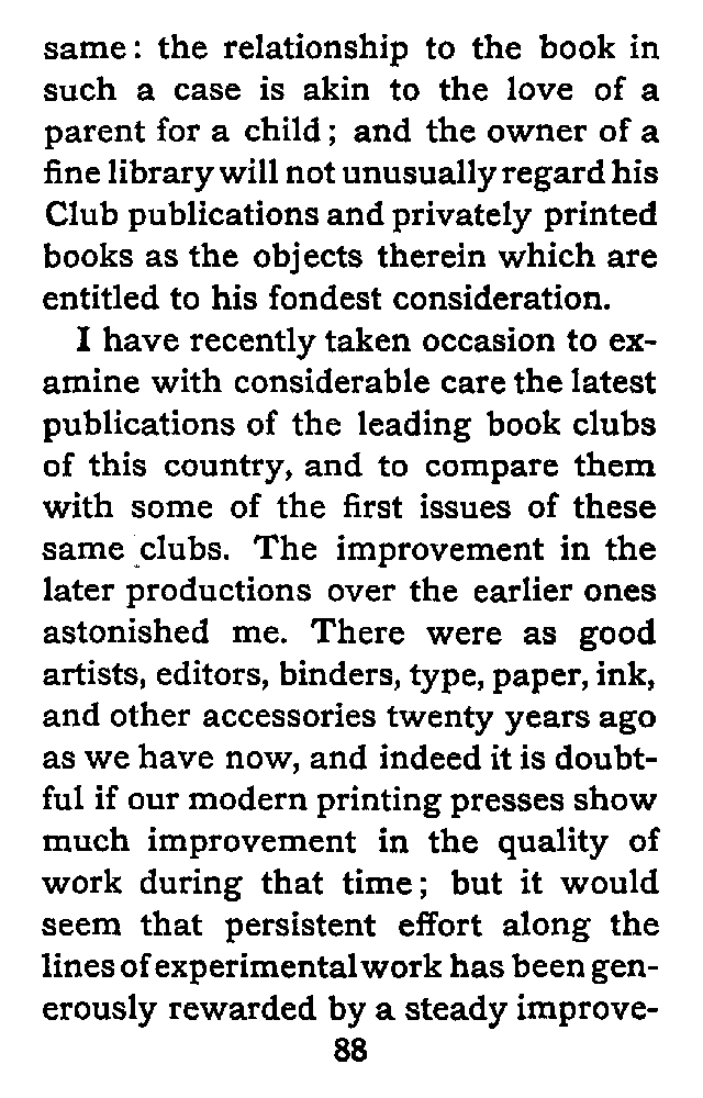 Very few people are able to appreciate the amount of gratuitous labor performed by the officers and committees of private book clubs. It is erroneous to suppose that beautiful books are a purely natural offspring of the book club. The preparation of the material for publication and successfully following it through all the various stages of manufacture requires an enormous amount of detail work, as well as an accurate knowledge of bookmaking. The president of a prominent book club recently said, in his annual address to the members:[86]—