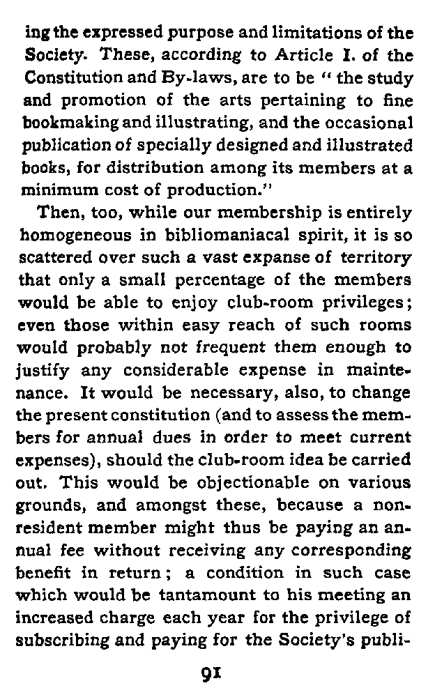 Then, too, while our membership is entirely homogeneous in bibliomaniacal spirit, it is so scattered over such a vast expanse of territory that only a small percentage of the members would be able to enjoy club-room privileges; even those within easy reach of such rooms would probably not frequent them enough to justify any considerable expense in maintenance. It would be necessary, also, to change the present constitution (and to assess the members for annual dues in order to meet current expenses), should the club-room idea be carried out. This would be objectionable on various grounds, and amongst these, because a non-resident member might thus be paying an annual fee without receiving any corresponding benefit in return; a condition in such case which would be tantamount to his meeting an increased charge each year for the privilege of subscribing and paying for the Society's publications.[92] Hence, the Council do not see their way to entertaining or recommending the club-room feature. But it is not supposed that the spirit of fellowship among our bibliophiles—naturally related as they are by a kindred interest—will in any degree suffer because of the lack of such facilities. A personal contact, however agreeable, does not seem essential. Certainly the many charming letters received from members whom we have never seen, go far to relieve the present lack in this regard, so far as the officers are concerned.