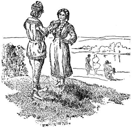 It was this group of Indian maidens that now attracted the gaze of the young stranger; one among them particularly, not yet seventeen, but more beautiful than the others, walked like some society queen on the beach at Newport. In a few moments she purposely separated herself from the rest and directed her steps toward the mound[243] on which the young man was lying. He smiled when he saw her evident intention, and a flush of pride swept over his bronzed cheeks as he came down to the base of the elevation to await her approach.