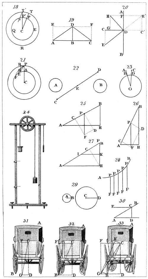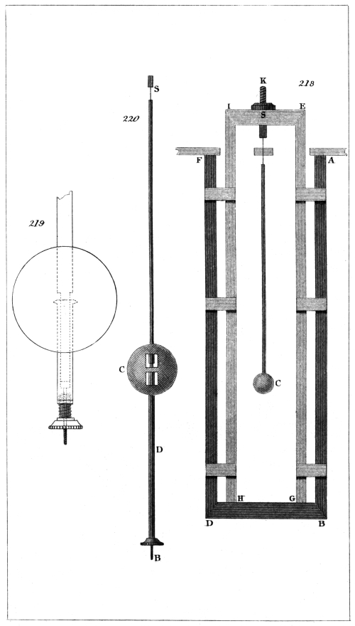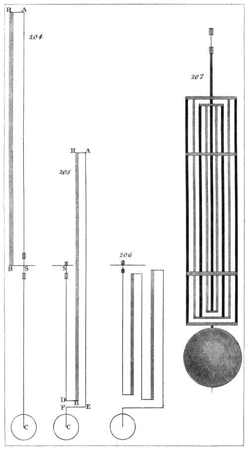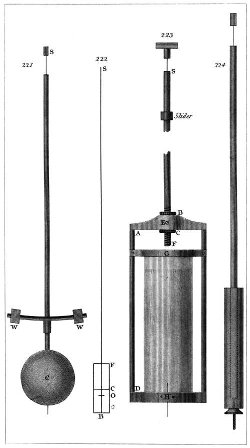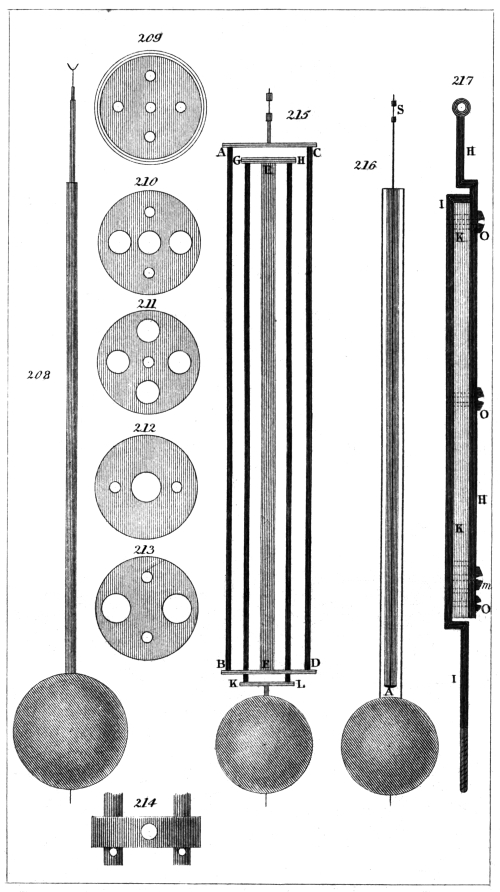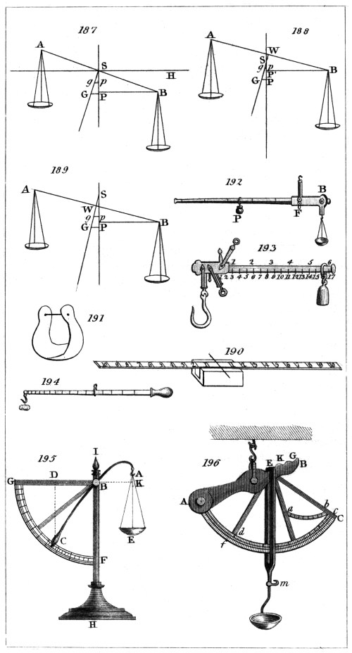 | Weight.—Time.—The Balance.—Fulcrum.—Centre of Gravity of.—Sensibility of.—Positions of the Fulcrum.—Beam variously constructed.—Troughton’s Balance.—Robinson’s Balance.—Kater’s Balance.—Method of adjusting a Balance.—Use of it.—Precautions necessary.—Of Weights.—Adjustment of.—Dr. Black’s Balance.—Steelyard.—Roman Statera or Steelyard.—Convenience of.—C. Paul’s Steelyard.—Chinese Steel-yard.—Danish Balance.—Bent Lever Balance.—Brady’s Balance.—Weighing Machine for Turnpike Roads.—Instruments for Weighing by means of a Spring.—Spring Steelyard.—Salter’s Spring Balance.—Marriott’s Dial Weighing Machine.—Dynamometer.—Compensation Pendulums.—Barton’s Gridiron Pendulum.—Table of linear Expansion.—Second Table.—Harrison’s Pendulum.—Troughton’s Pendulum.—Benzenberg’s Pendulum.—Ward’s Compensation Pendulum.—Compensation Tube of Julien le Roy.—Deparcieux’s Compensation.—Kater’s Pendulum.—Reed’s Pendulum.—Ellicott’s Pendulum.—Mercurial Pendulum.—Graham’s Pendulum.—Compensation Pendulum of Wood and Lead.—Smeaton’s Pendulum.—Brown’s Mode of Adjustment. |
