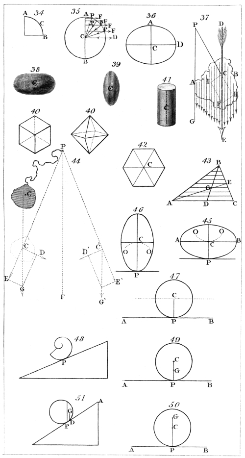 | Force perpendicular to a Plane.—Oblique Force.—Inclined Plane.—Weight produces Pressure and Motion.—Motion uniformly accelerated.—Space moved through in a given Time.—Increased Elevation produces increased Force.—Perpendicular and horizontal Plane.—Final Velocity.—Motion down a Curve.—Depends upon Velocity and Curvature.—Centrifugal Force.—Circle of Curvature.—Radius of Curvature.—Whirling Table.—Experiments.—Solar System.—Examples of centrifugal Force. | |