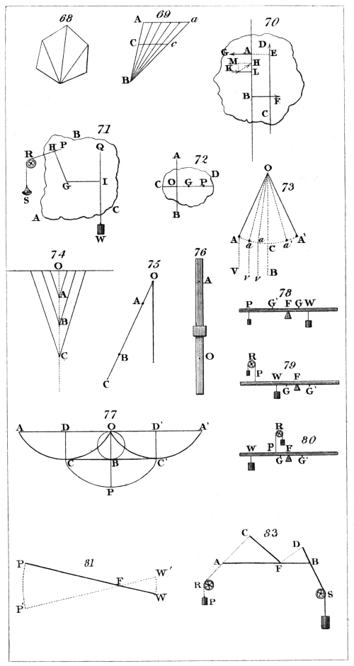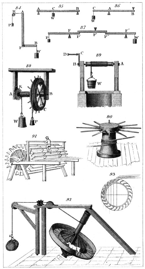 | Arms.—Fulcrum.—Three Kinds of Levers.—Crow Bar.—Handspike. —Oar.—Nutcrackers.—Turning Lathe.—Steelyard.—Rectangular Lever.—Hammer.—Load between two Bearers.—Combination of Levers.—Equivalent Lever. | |