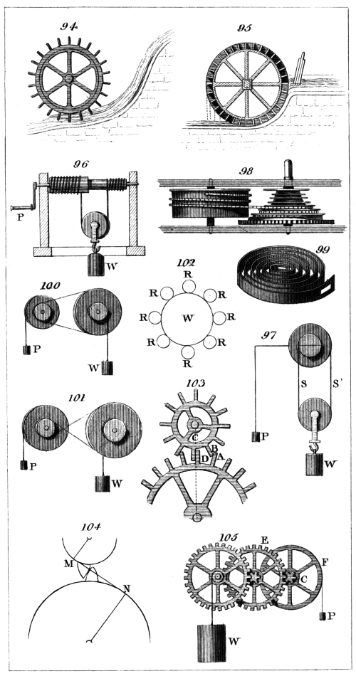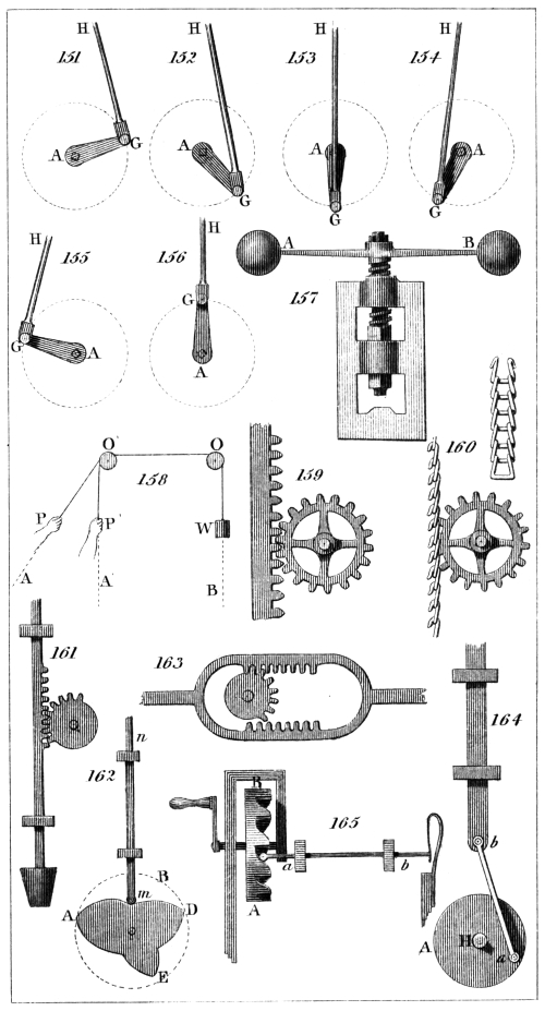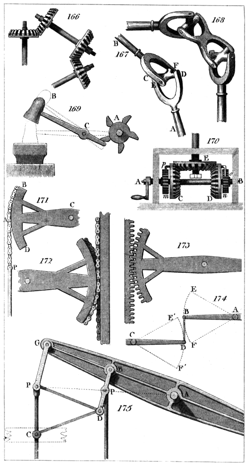 | Division of Motion into rectilinear and rotatory.—Continued and reciprocating.—Examples.—Flowing Water.—Wind.—Animal Motion.—Falling of a Body.—Syringe-Pump.—Hammer.—Steam-Engine.—Fulling Mill.—Rose-Engine.—Apparatus of Zureda.—Leupold’s Application of it.—Hooke’s universal Joint.—Circular and alternate Motion.—Examples.—Watt’s Methods of connecting the Motion of the Piston with that of the Beam.—Parallel Motion. | |