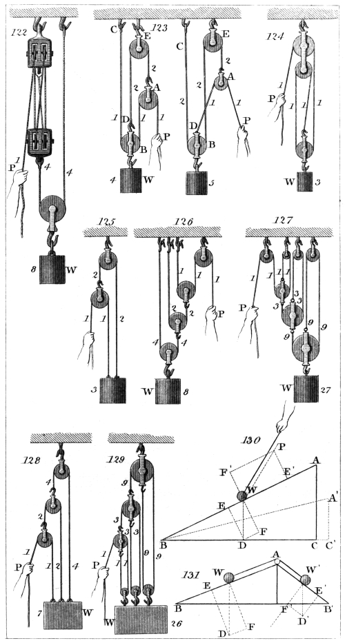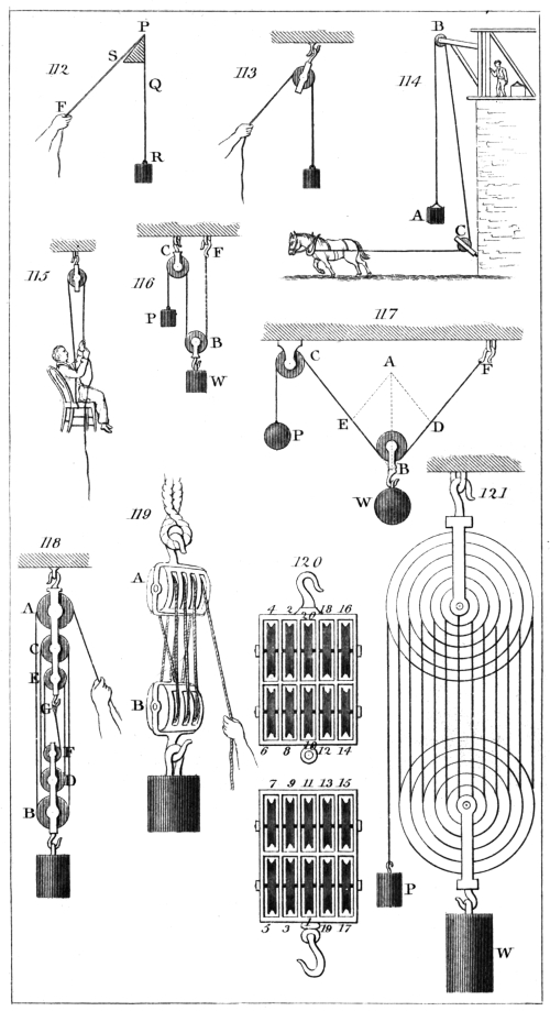 | Cord.—Sheave.—Fixed Pulley.—Fire Escapes.—Single moveable Pulley.—Systems of Pulleys.—Smeaton’s Tackle.—White’s Pulley.—Advantage of.—Runner.—Spanish Bartons. | |