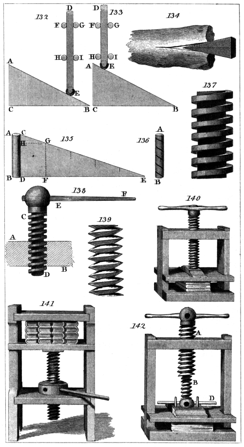 | Inclined Plane.—Effect of a Weight on.—Power of.—Roads.—Power Oblique to the Plane.—Plane sometimes moves under the Weight.—Wedge.—Sometimes formed of two inclined Planes.—More powerful as its Angle is acute.—Where used.—Limits to the Angle.—Screw.—Hunter’s Screw.—Examples.—Micrometer Screw. | |