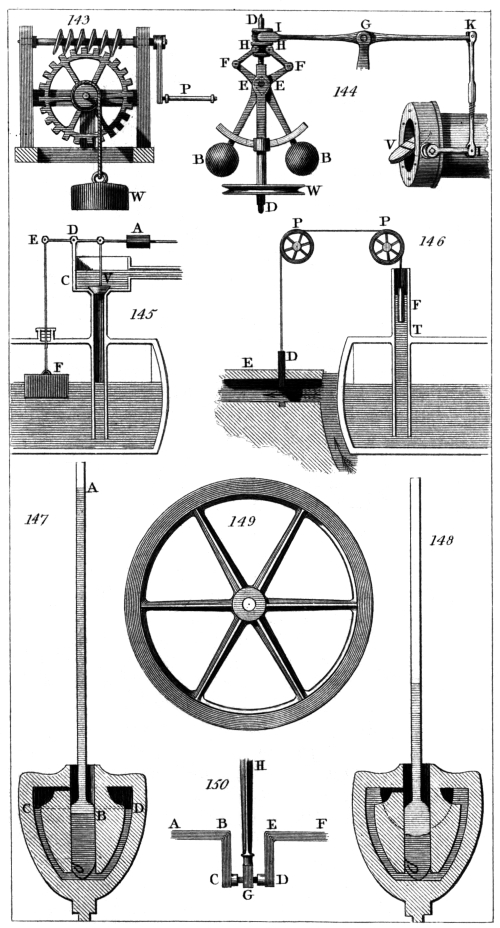 | Uniformity of Operation.—Irregularity of prime Mover.—Water-Mill.—Wind-Mill.—Steam Pressure.—Animal Power.—Spring.—Regulators.—Steam-Engine.—Governor.—Self-acting Damper.—Tachometer.—Accumulation of Power.—Examples.—Hammer.—Flail.—Bow-string.—Fire Arms.—Air-Gun.—Steam-Gun.—Inert Matter a Magazine for Force.—Fly-Wheel.—Condensed Air.—Rolling Metal.—Coining-Press. | |