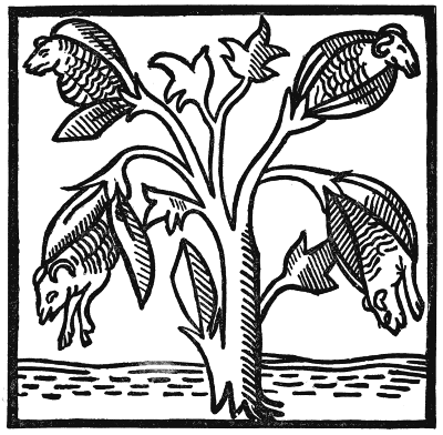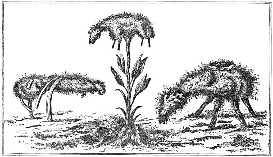 “You may regard as beyond ridicule this wonderful Tartar plant. The most renowned of the Tartar hordes of the present day, by its reputation, its antiquity, and its nobility, is that of the Zavolha. These people sow a seed like that of the melon, but rather smaller, from which springs and grows out of the earth a plant which they call ‘Borametz,’ i.e. ‘the Lamb.’ This plant grows to the height of three feet in the likeness of a real lamb, having feet, hoofs, ears, and a head perfect with the exception of horns, instead of which the plant has hairs in the form of horns. Its skin is soft and delicate, and is used in Tartary for head-gear. The internal pulp is said to be like the flesh of the cray-fish, and to have an agreeable flavour;[15] but if an incision be made, real blood flows from it. The root or stalk which rises from the earth is attached to the navel of the lamb, and (which is more remarkable) whilst the plant is surrounded with herbage it lives as does a lamb, but as soon as it has consumed all within its reach it withers and dies. This does not happen by the arrival of the plant at any definite period of its growth, for it has been found by experiment that if the grass around it be removed it perishes. Another most curious circumstance connected with it is that wolves will eat it with avidity, though no other carnivorous animals will attack it. This,” says Scaliger, still apostrophizing Cardano, “is merely a little sauce and seasoning to your allusion to the fable of the Lamb; but I would like to know from you how four distinct legs and their feet can be produced from one stem.”