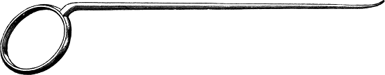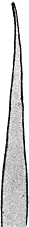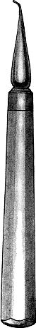 The instrument from which the illustration was made was furnished by Dr. Palmer, and is shown full size. Instruments for use on posterior teeth were short and strong, with as few curves as possible; no right and left cutters or pluggers were used, and none of the latter were serrated, but had straight, tapering round points, flat on the ends, and of suitable size to fill a good portion of the cavity. He used what was termed Abbey's chemically pure tin foil, forcing it in hard, layer upon layer,—as he expressed it, "smacked it up." In this manner he made tin fillings that lasted more than thirty years.