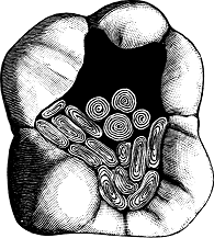 Cylinders were used which were a little longer than the depth of the cavity, introduced with wedge-shaped pluggers around the walls, each one being closely adapted to the margin; then another row was added, which was forced firmly against the preceding, continuing this process until the cavity was full. The wedge, having a smooth end and sides, is forced into the center so as to drive the tin toward the sides of the cavity, being careful not to split the tooth; the opening is then filled with a cylinder. Now force a smaller-sized wedge into the center of the last cylinder, and into the opening introduce another cylinder, proceeding in this manner until the filling is solid. Then condense the ends of the cylinders, trim, and burnish. For the same operation more recent pluggers are wedge-shaped, with sharp, deep serrations. In these cases the filling is retained by the general form of the cavity and wedging within a certain limit, and not by cohesion of the different parts. For a time tin cylinders were prepared and put on sale at the dental depots.