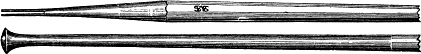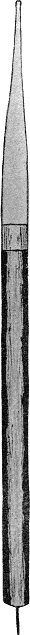 "The 'point' shown full size in Fig. 8 is of more general application than any of the others, and is[85] used for proximal cavities in bicuspids, also labial and buccal cavities. The handle is made of ebony, and has a silver ferrule, from which the ivory extends to the end and completes the instrument.