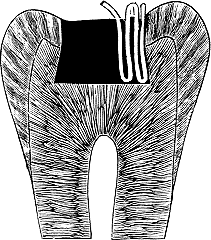 A later method of filling with tape or rope is to use wedge-shaped pluggers with sharp serrations, filling the ends of the cavity, and as the two parts approach each other that next to the wall should be in advance of the rest, thus an opening will be left in the center which can be filled with a smaller tape or rope.