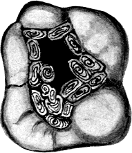 "In the interglobular spaces there is a substance which is called amorphous or structureless, and a filling to be in harmony with this substance should be amorphous or structureless in its composition. The only materials we have which meet these conditions are gutta-percha and tin. It is its structureless character that gives to tin its value. Coming in contact with the living dentin, it is easily adapted, and does not excite inflammation; it does not interfere with the process going on within the teeth to heal the lesion caused by caries. A wound from a bullet made of tin, unless it struck a vital part, nature would heal, even if the cause of the wound was not removed, by encysting the ball. This process of nature of repairing injury by encysting[82] the cause is of interest to the dentist in the study of suitable filling-materials. Tin is very useful at the cervical margin of cavities; it acts as an antiseptic or preservative, and reduces the liability to subsequent decay. It is our endeavor to obtain a filling that will preserve the teeth and reduce the liability to, if not wholly prevent, secondary decay. The law of correspondence is of more consequence than the mechanical construction of the filling. Tin can be used without that rigid adherence to mechanical rule that is necessary to retain a filling of cohesive gold; thus less of the tooth needs to be sacrificed.