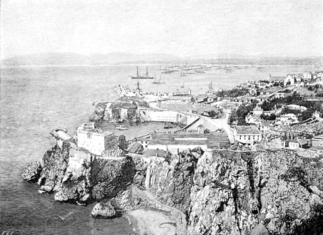 But is not this an over-estimate of the value of Gibraltar to England? Is it worth all it costs? Would it weigh much in the balance in a great contest of nations for the mastery of the world? The object of this Rock-fortress is to command the passage into the Mediterranean. The arms of Gibraltar are a Castle and a Key, to signify that it holds the key of the Straits, and that no ship flying any other flag than that of England can enter or depart except by her permission. But that power is already gone. England may hold the key of the Straits, but the door is too wide to be bolted. The hundred-ton guns of Gibraltar, even if aimed directly seaward, could not destroy or stop a passing fleet. I know this is not the limit of construction in modern ordnance. Guns have been wrought weighing a hundred and twenty tons, which throw a ball weighing a ton over ten miles! Such a gun mounted at Tarifa might indeed hurl its tremendous bolt across the Mediterranean into Africa. But Tarifa is in Spain, while opposite Gibraltar it is fourteen miles to Ceuta, a point not to be reached by any ordnance in existence, even if the last product of modern warfare were mounted on the height of O'Hara's Tower; so that a fleet of ironclads, hugging the African coast, would be quite safe from the English fire, which could not prevent the entrance of a French or German or Russian fleet into the Mediterranean, if it were strong enough to encounter the English fleet.