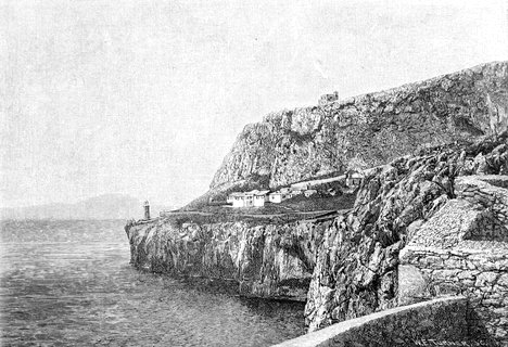 On one of the last days I had engaged to take a midday dinner with the pastor of the Scotch Church, who lives in the southern part of the town. It is a pleasant walk beyond the Alameda over the hill, where you can but stop now and then to look down on the long breakwater of the New Mole, or into the quiet dock of Rosia Bay; or to hear the bugles waken the echoes of the hills. After dinner my friend proposed a stroll, in which I was glad to join him, especially as it took me to new points of view, from which I could look up at the Rock on its southern side, as I had already seen it on the north. Taking our way across the level plateau of Windmill Hill, past barracks and hospitals that are here somewhat retired from the shore, we descended toward the sea.